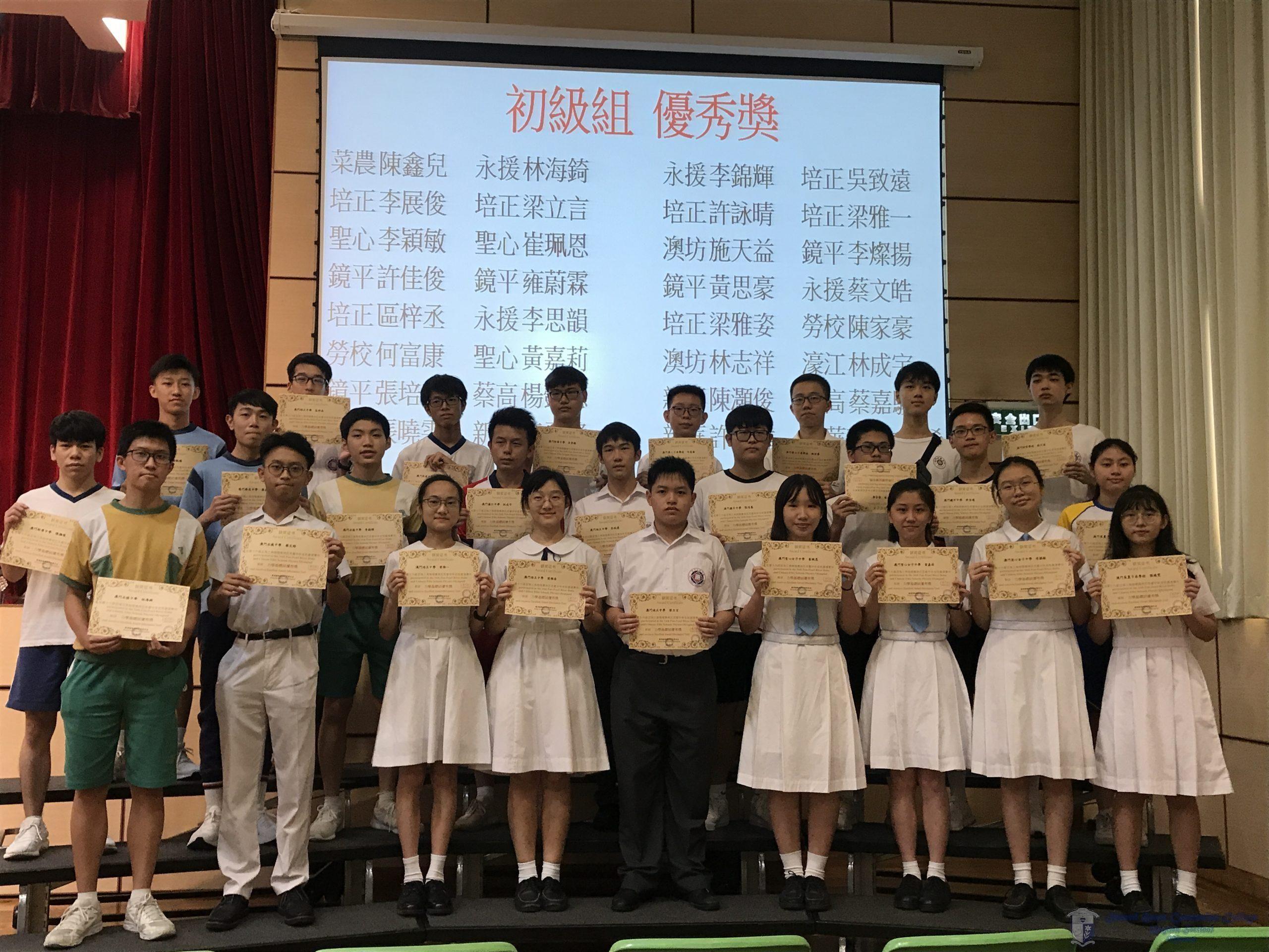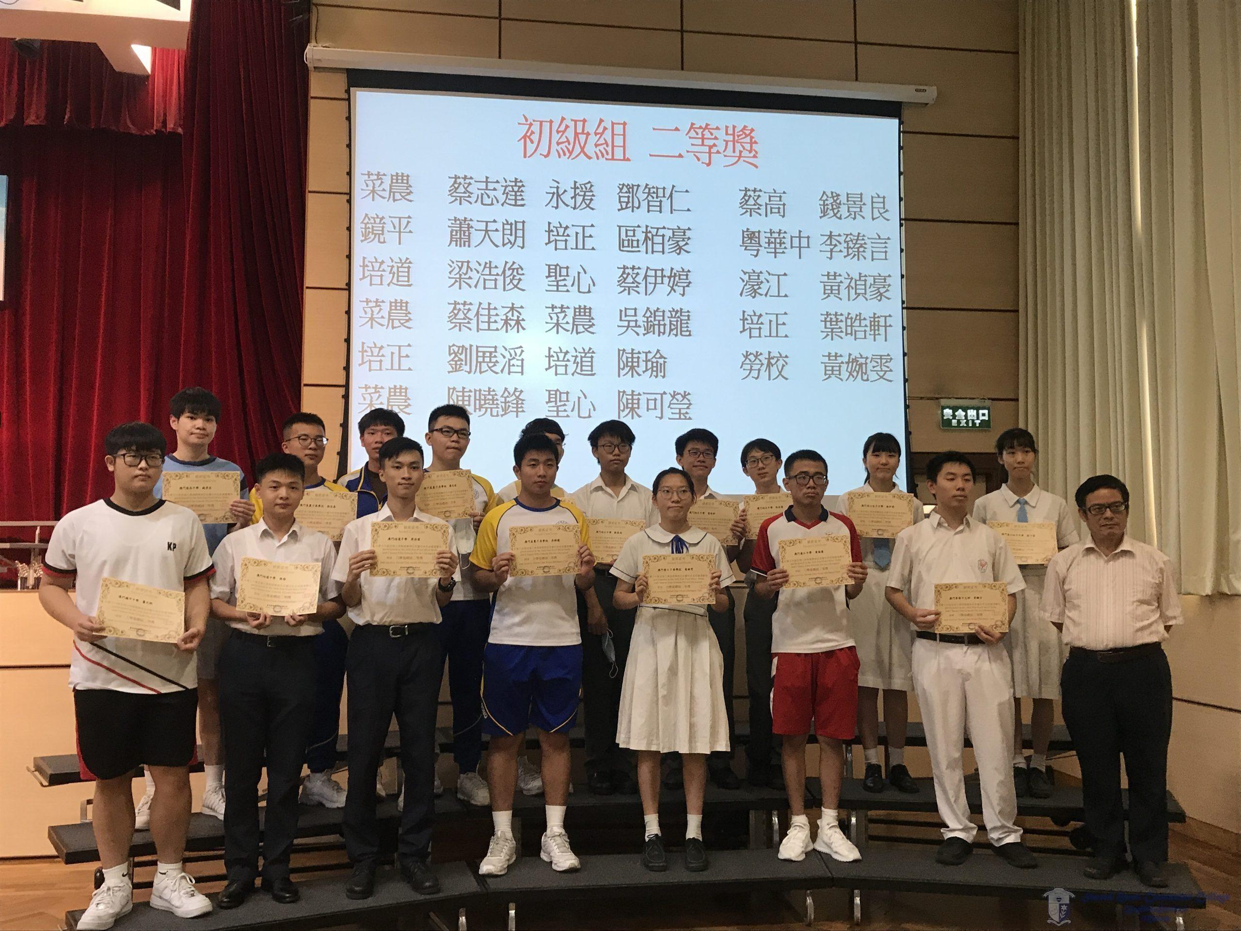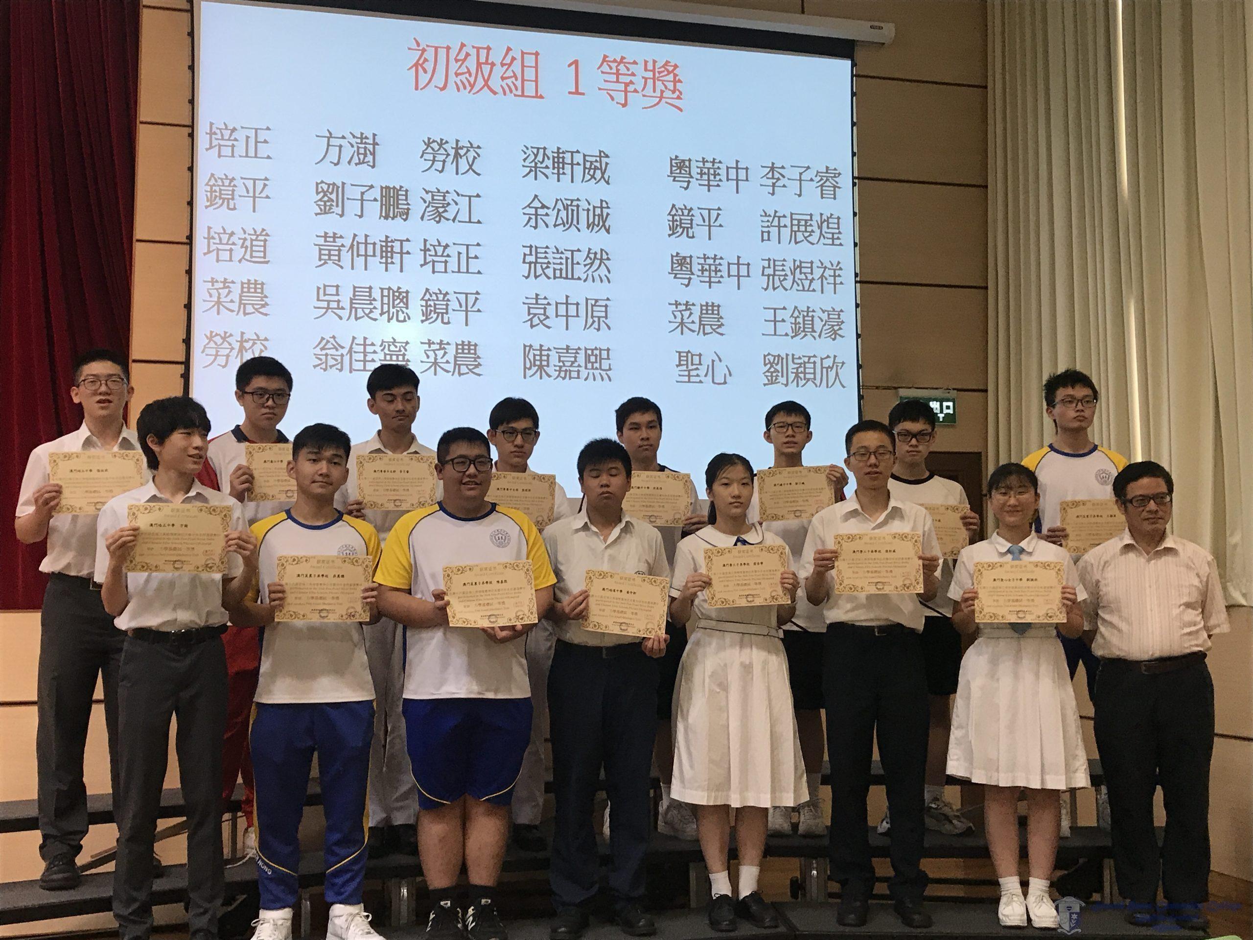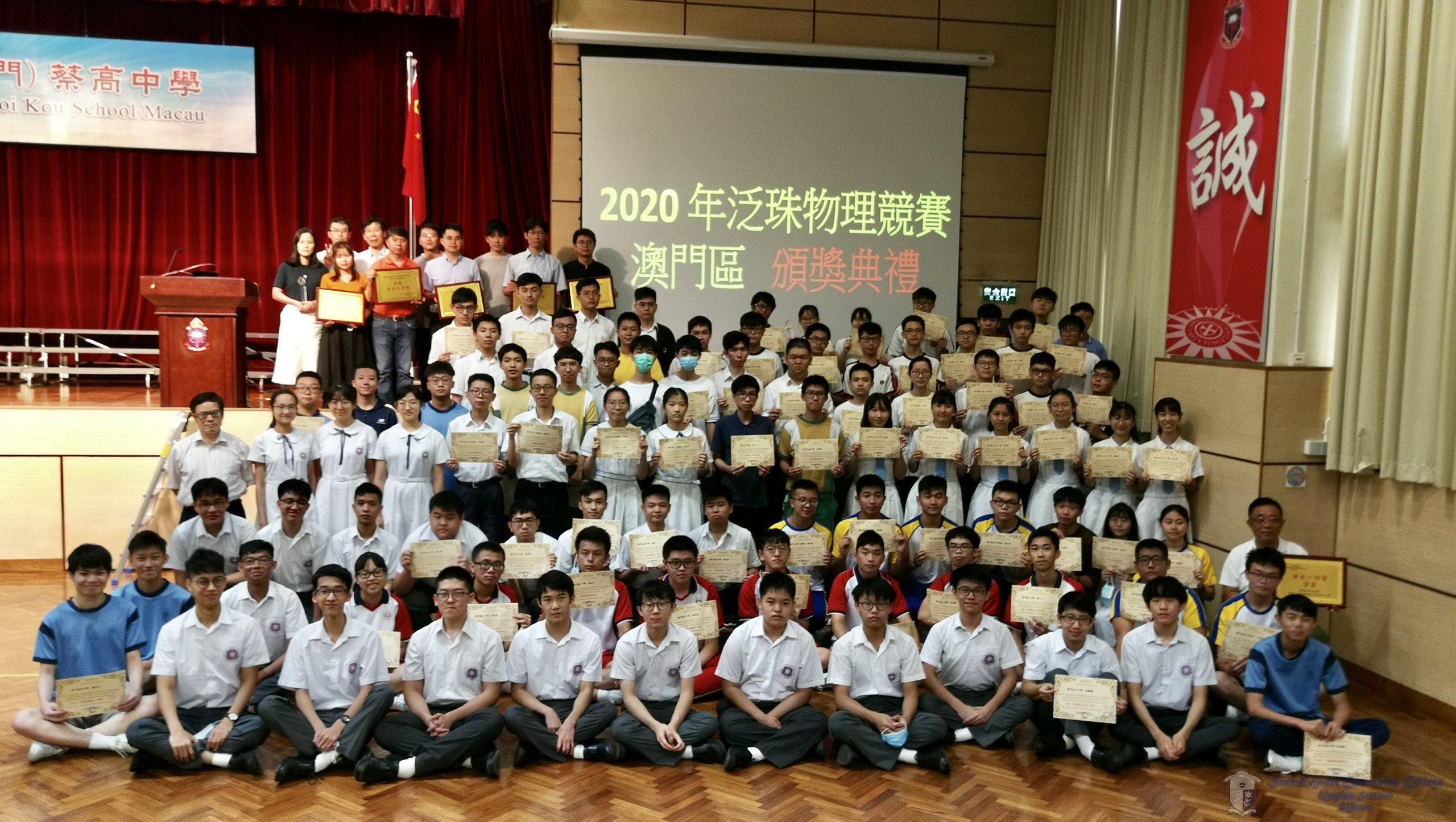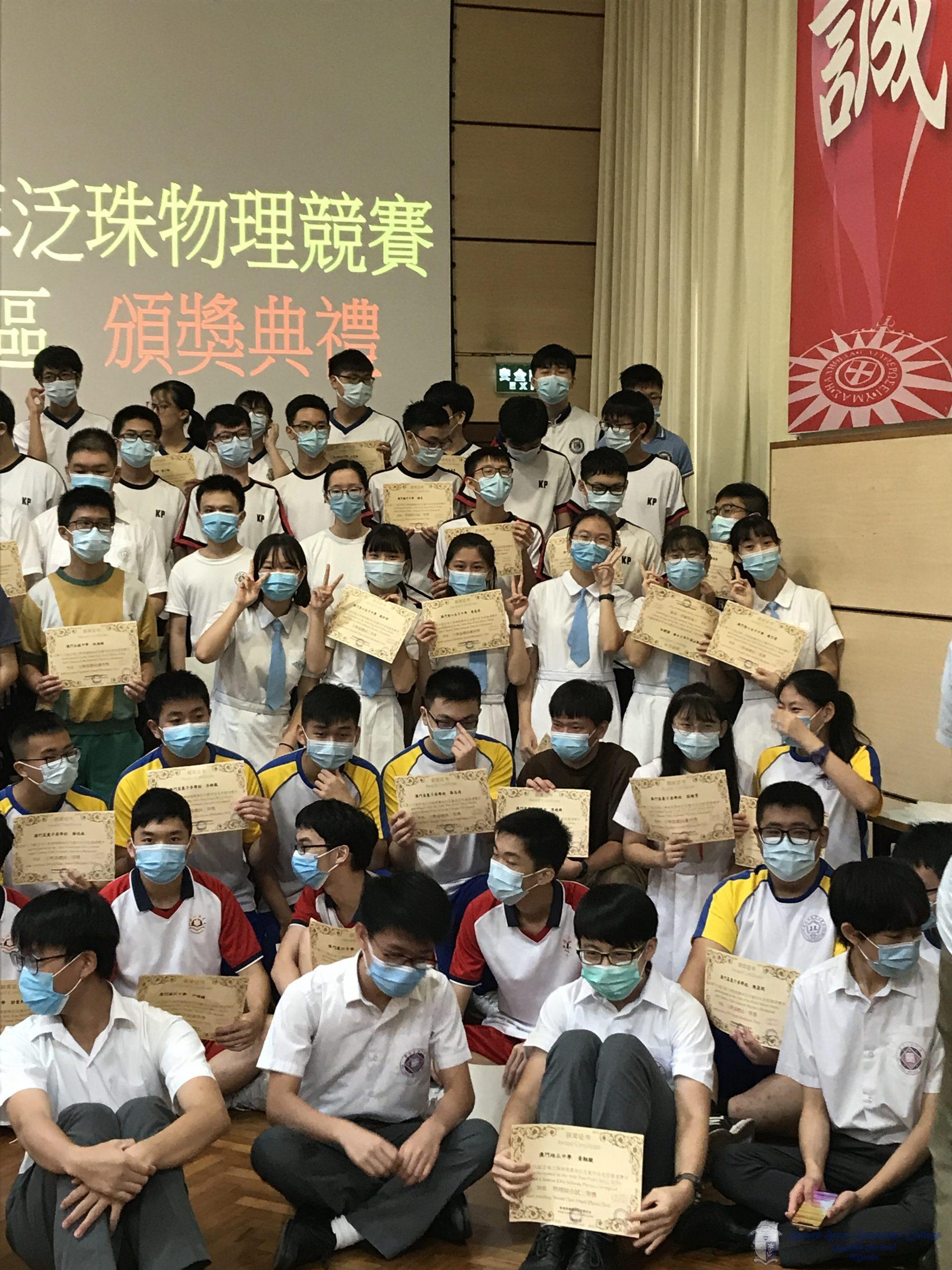 由澳門大學及澳門物理奧林匹克中心舉辦的「第十六屆泛珠三角物理奧林匹克競賽」於八月上旬舉行,該比賽由香港科技大學負責命題,全方位考核學生的物理水平及解難能力。本校高一甲班同學經過多月的辛勤準備與學習,最終獲得了優異成績。獲獎名單如下: