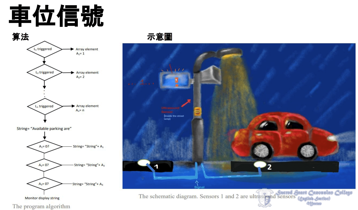 這個設計的主要係針對澳門常見的交通問題,例如交通事故造成塞車現象和,私家車街位分配不平均而導至「搵位難」的現象。設計中同學們運用了課堂上學到的微控制器「Microbit」技術,通過編程來把多種訊號傳感器組合成一個「交通事故通報系統」和「待用車位偵測系統」。透過這個系統,司機們可以通過安裝在路邊橙柱上的廣播器得知附近的交通事故和街位訊息,從而選擇合理的行車路線。