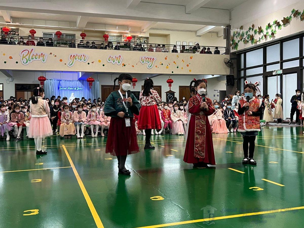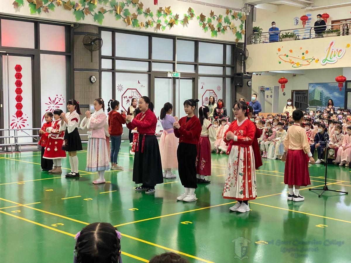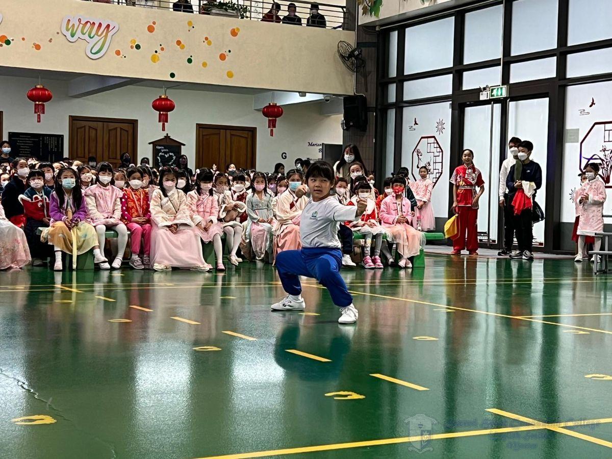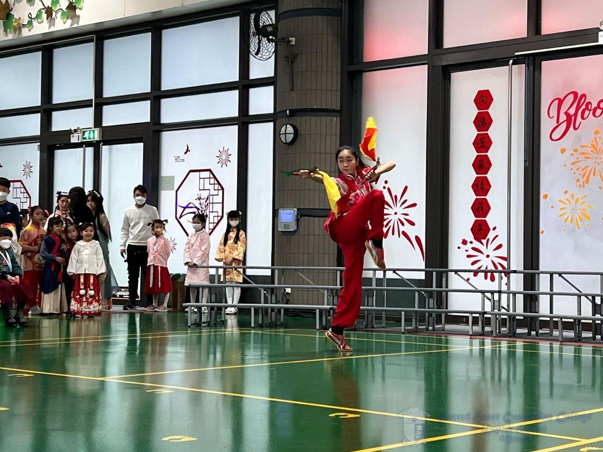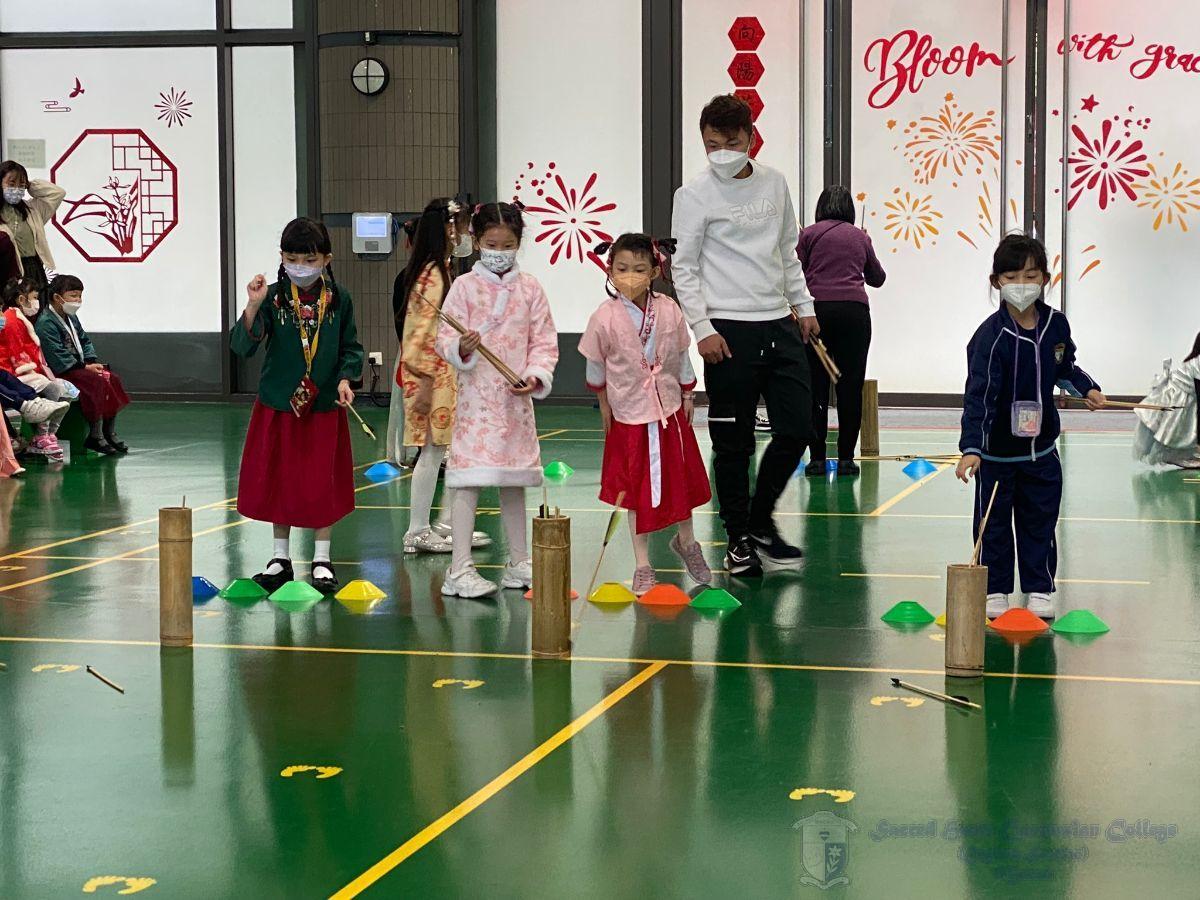 在小學文化日環節中,本校體育組老師先以「氣球爆竹」製造熱鬧氣氛,為當天活動拉開序幕。接着,是小學師生們的精彩表演:有小學合唱團獻唱《恭喜恭喜》,為大家送上新年祝福;中樂團及弦樂團演奏《旱天雷》和《瑤族舞曲》,展現出不同地域代表性樂章的獨特魅力;古詩《元日》吟誦表演;粵劇訓練班的曲藝《少年志》和折子戲《表花》;精彩的武術表演「通臂拳」和「子午鴛鴦鉞」。而為了讓學生認識和感受更多中華文化的精粹,活動亦安排了師生介紹「立春」故事和古代玩藝「投壺」,更進行了「最佳中國傳統服飾比賽—決賽」。參賽者的服飾各有特色,璀璨華美,師生們都沉浸在絕美的視覺享受中。小學文化日尾聲,有中國鼓團隊的學生為我們帶來《滾核桃》表演,以音樂向大家呈現了一幅人民在春節時熱烈歡騰的場面。