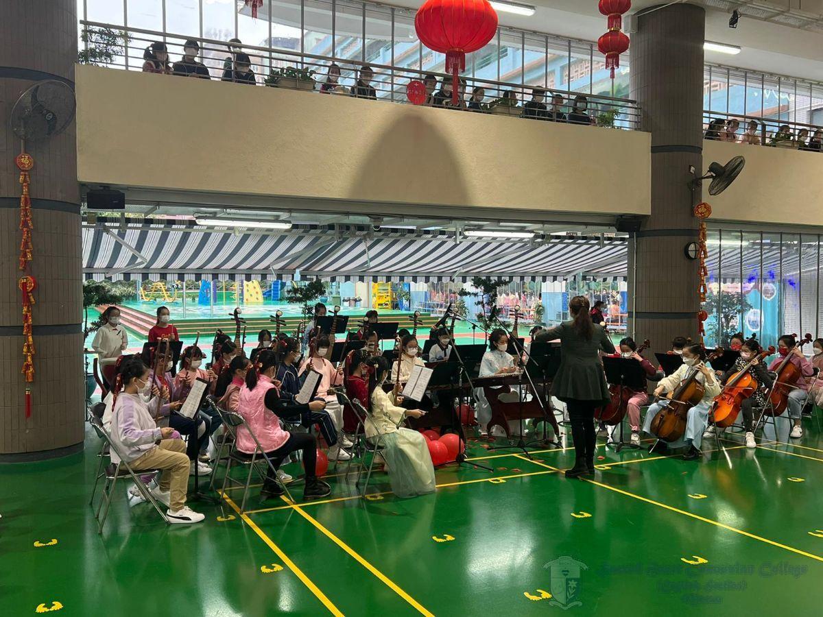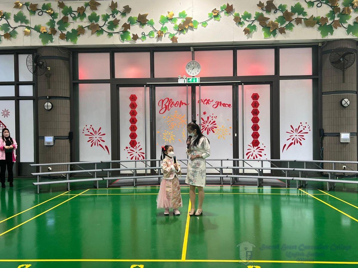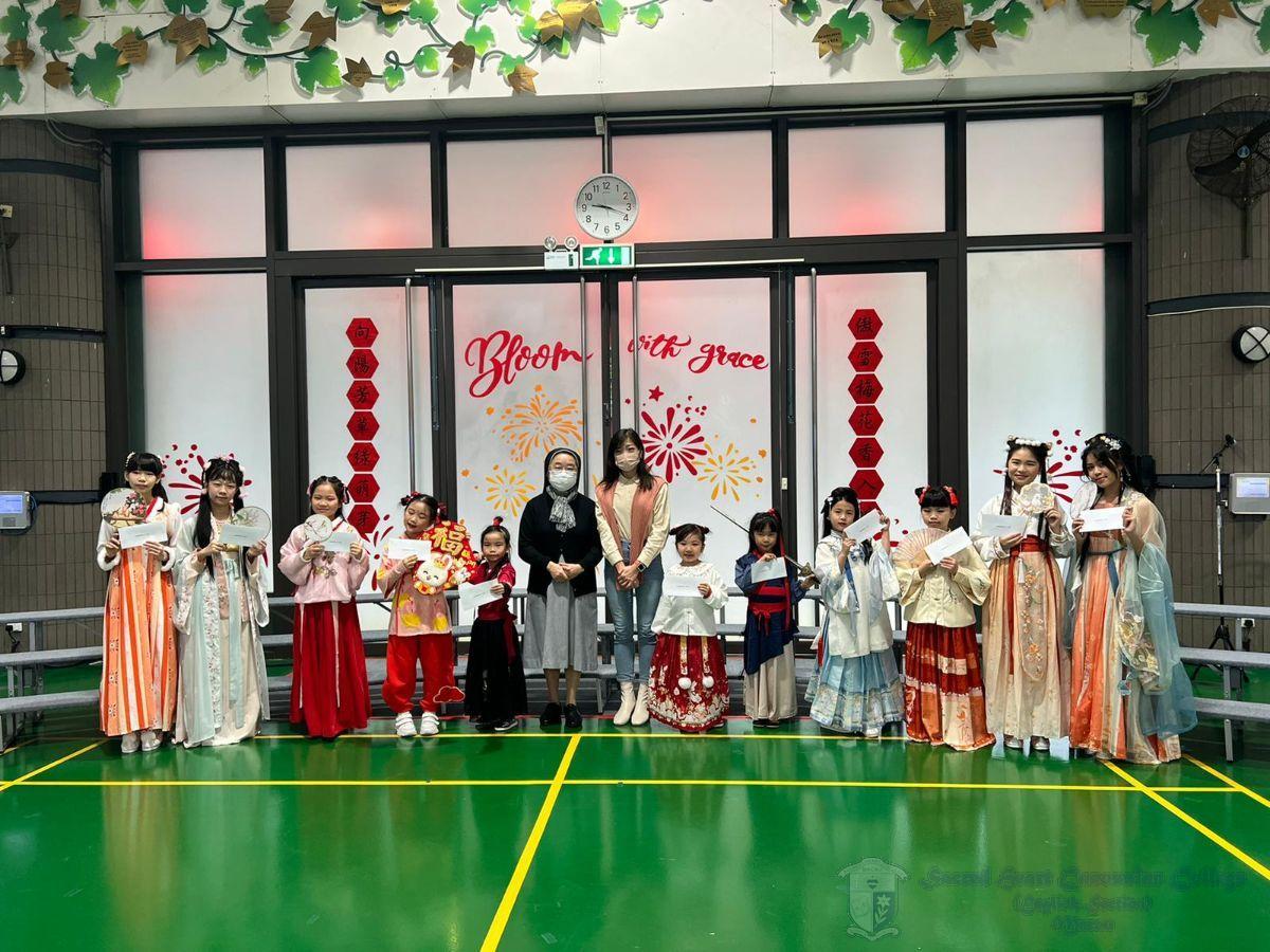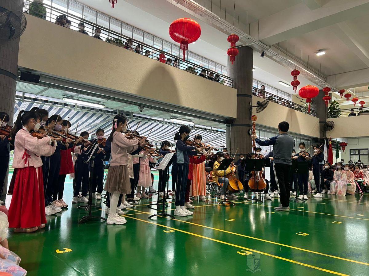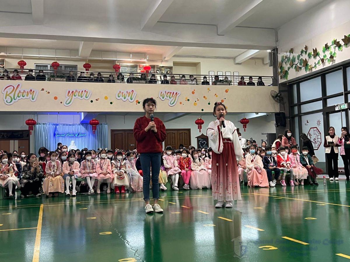 在小學文化日環節中,本校體育組老師先以「氣球爆竹」製造熱鬧氣氛,為當天活動拉開序幕。接着,是小學師生們的精彩表演:有小學合唱團獻唱《恭喜恭喜》,為大家送上新年祝福;中樂團及弦樂團演奏《旱天雷》和《瑤族舞曲》,展現出不同地域代表性樂章的獨特魅力;古詩《元日》吟誦表演;粵劇訓練班的曲藝《少年志》和折子戲《表花》;精彩的武術表演「通臂拳」和「子午鴛鴦鉞」。而為了讓學生認識和感受更多中華文化的精粹,活動亦安排了師生介紹「立春」故事和古代玩藝「投壺」,更進行了「最佳中國傳統服飾比賽—決賽」。參賽者的服飾各有特色,璀璨華美,師生們都沉浸在絕美的視覺享受中。小學文化日尾聲,有中國鼓團隊的學生為我們帶來《滾核桃》表演,以音樂向大家呈現了一幅人民在春節時熱烈歡騰的場面。