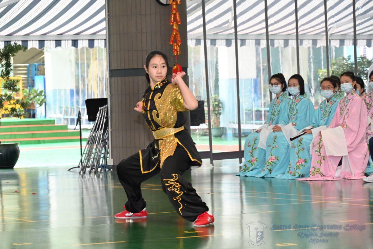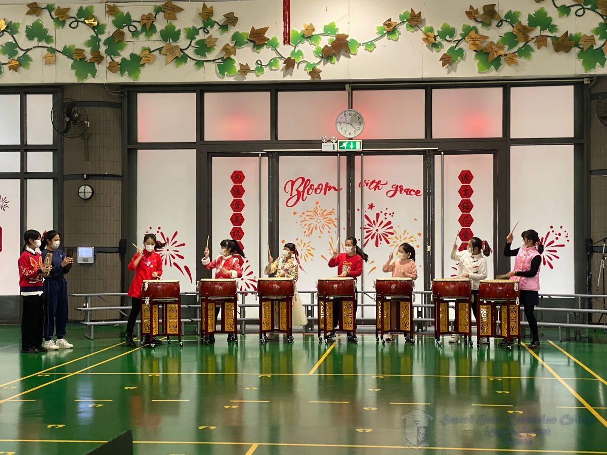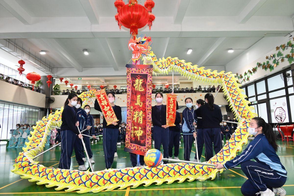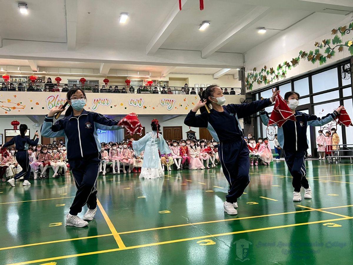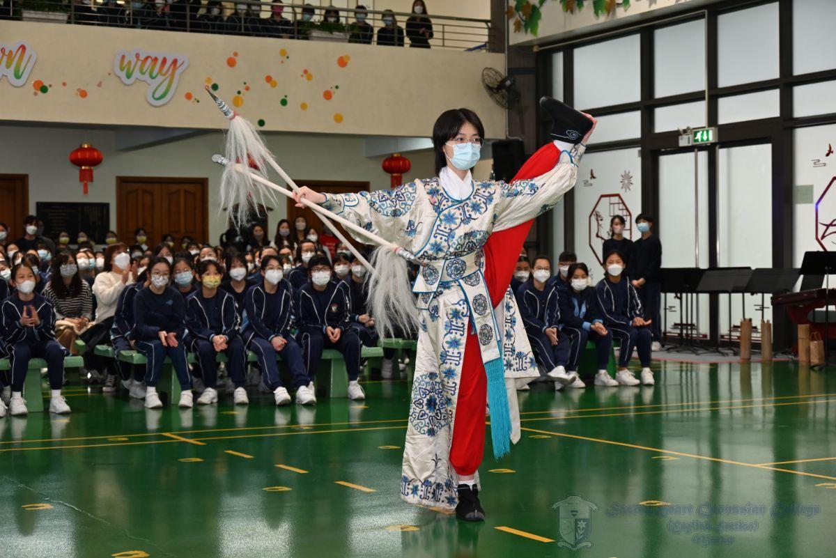 在中學文化日環節中,本校學生聯會成員以《澳門非物質文化遺產清單》的中國傳統民間藝術—「舞龍」為中學場活動拉開序幕。前校監鄭文玲修女、校長余家碧修女為彩龍點晴後,同學們隨即為大家呈獻了技藝超凡的演出。接着,是富豐精彩的表演:中國鼓獻技《秦王點兵》,再現了秦王李世民點兵出征、揮師北伐的宏大場面和宏偉氣魄;中樂團演奏傳統樂曲《步步高》,以輕快激昂旋律的給人以奮發上進的祝福;武術「八極拳法」和「南刀」表演;折子戲《草亭結拜》《雙槍陸文龍》《葉生》《孟姜女哭長城》。除表演外,我們亦邀請了同學及老師參與中國傳統遊戲—「投壺」和「踢毽」,師生們濟濟一堂,樂在其中。活動尾聲,本校兩位老師以歌喉獻藝,演唱帶有中國傳統特色的《菊花台》《老派約會之必要》。最後,各班學生代表高舉由同學親筆書寫的揮春,為全體師生獻上吉祥祝福。