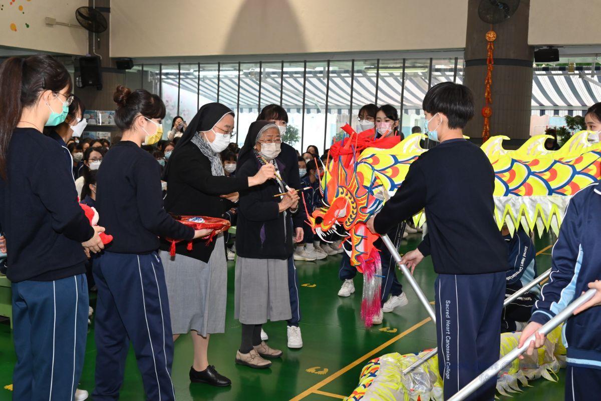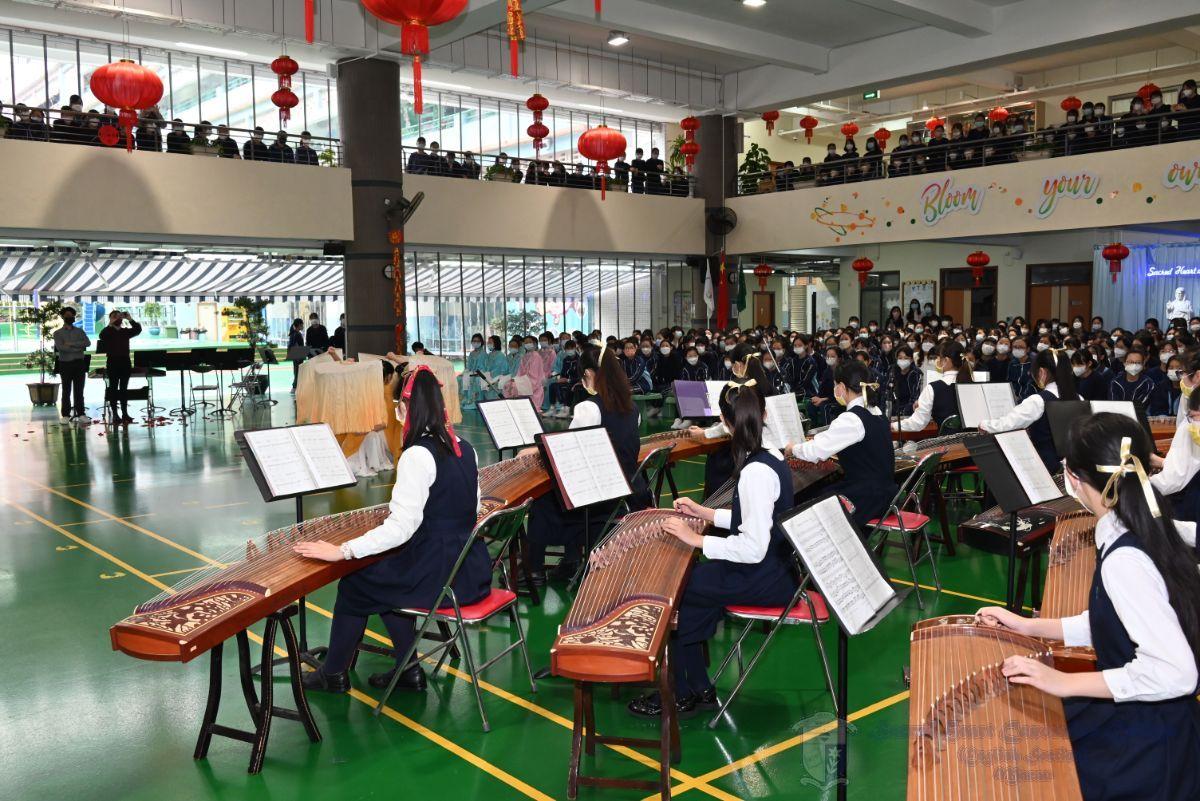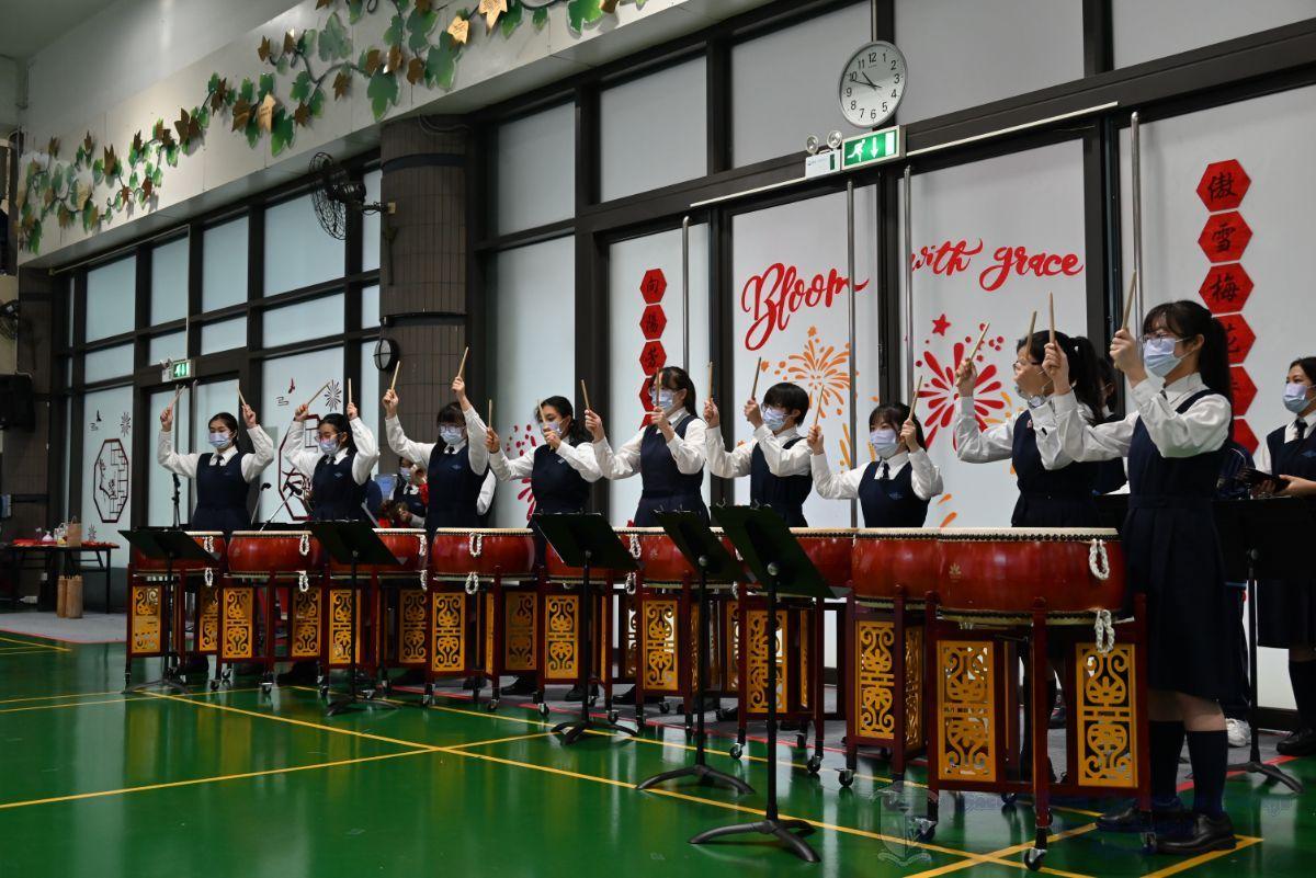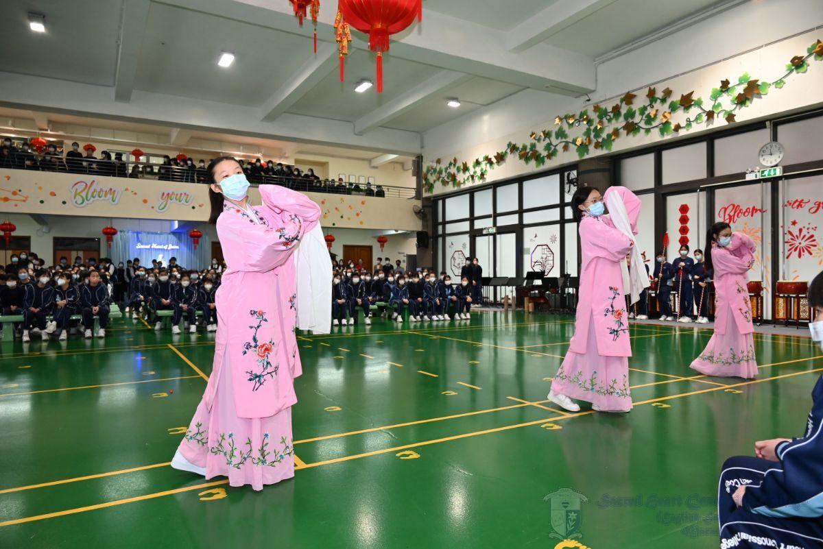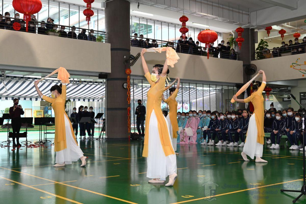 在中學文化日環節中,本校學生聯會成員以《澳門非物質文化遺產清單》的中國傳統民間藝術—「舞龍」為中學場活動拉開序幕。前校監鄭文玲修女、校長余家碧修女為彩龍點晴後,同學們隨即為大家呈獻了技藝超凡的演出。接着,是富豐精彩的表演:中國鼓獻技《秦王點兵》,再現了秦王李世民點兵出征、揮師北伐的宏大場面和宏偉氣魄;中樂團演奏傳統樂曲《步步高》,以輕快激昂旋律的給人以奮發上進的祝福;武術「八極拳法」和「南刀」表演;折子戲《草亭結拜》《雙槍陸文龍》《葉生》《孟姜女哭長城》。除表演外,我們亦邀請了同學及老師參與中國傳統遊戲—「投壺」和「踢毽」,師生們濟濟一堂,樂在其中。活動尾聲,本校兩位老師以歌喉獻藝,演唱帶有中國傳統特色的《菊花台》《老派約會之必要》。最後,各班學生代表高舉由同學親筆書寫的揮春,為全體師生獻上吉祥祝福。