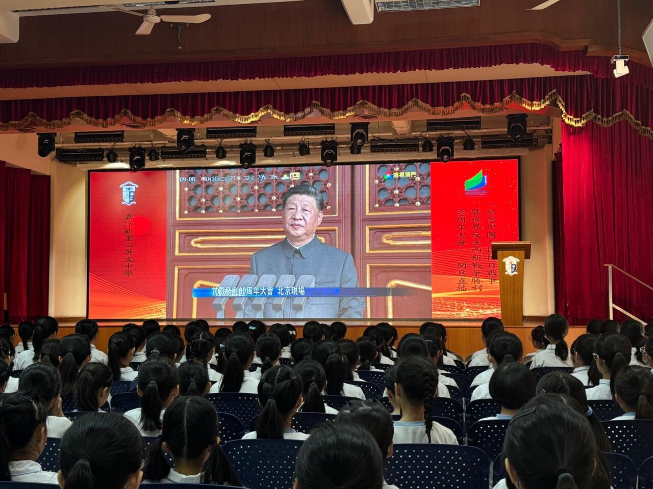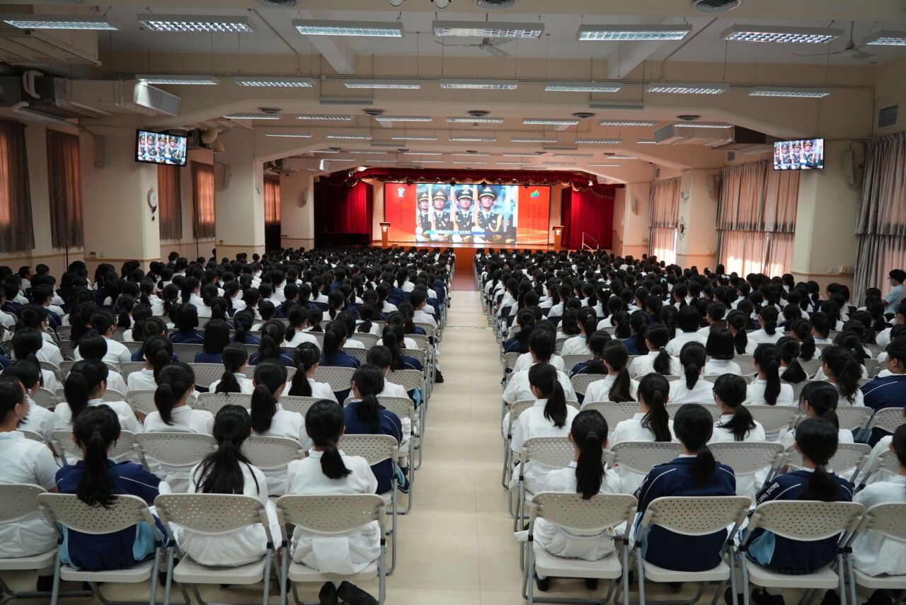 師生在禮堂觀看閱兵直播