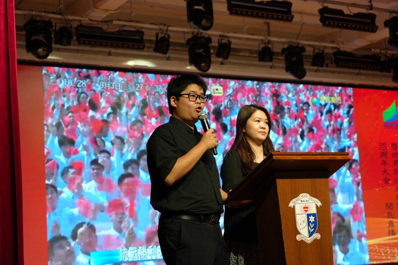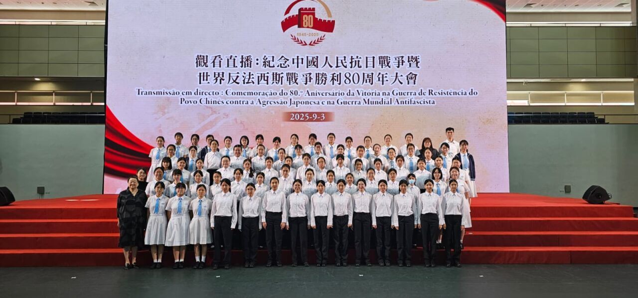 上午,本校師生在學校操場舉行升旗禮,並以抗戰勝利80周年、銘記歷史、珍愛和平為題作為主題分享。我校亦組織43名歌詠團學生參與假澳門理工大學體育館舉行的紀念活動並合唱愛國歌曲,38名教師及領袖生到場觀看閱兵直播。八百名師生齊聚學校禮堂,共同觀看閱兵直播,在莊嚴肅穆的氛圍中緬懷歷史、致敬先烈、見證國家力量。