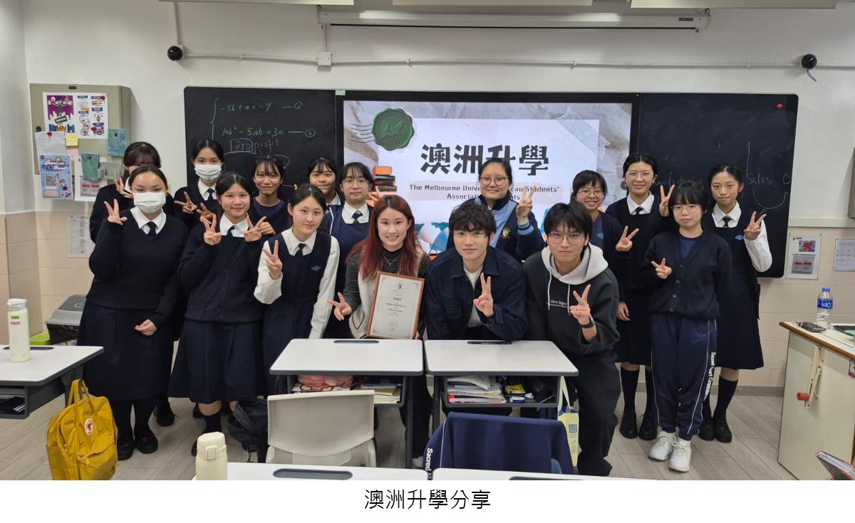 活動當天,我們榮幸邀請到來自香港中文大學的代表、墨爾本大學澳門學生會成員、本校成功保送澳門大學的應屆畢業生,以及正在澳門、內地及香港高校就讀的校友回校分享。嘉賓們透過親身經歷,向中五級學生詳細介紹了各地升學途徑、學科選擇、學習心得及精彩校園生活,為同學們明年升學部署提供了寶貴指引。