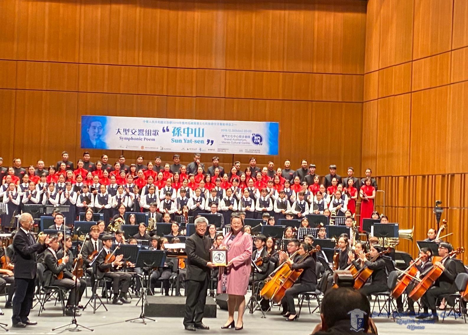 在演出前,中山市政協主席丘樹宏、澳門青年交響樂團協會副會長黃義滿、澳門音樂教師協會理事長張曉荔在台上互贈紀念品。大家期望透過音樂藝術形式,讓更多澳門市民,尤其青少年認識一代偉人孫中山的生平,傳承他自由博愛、天下為公的精神。