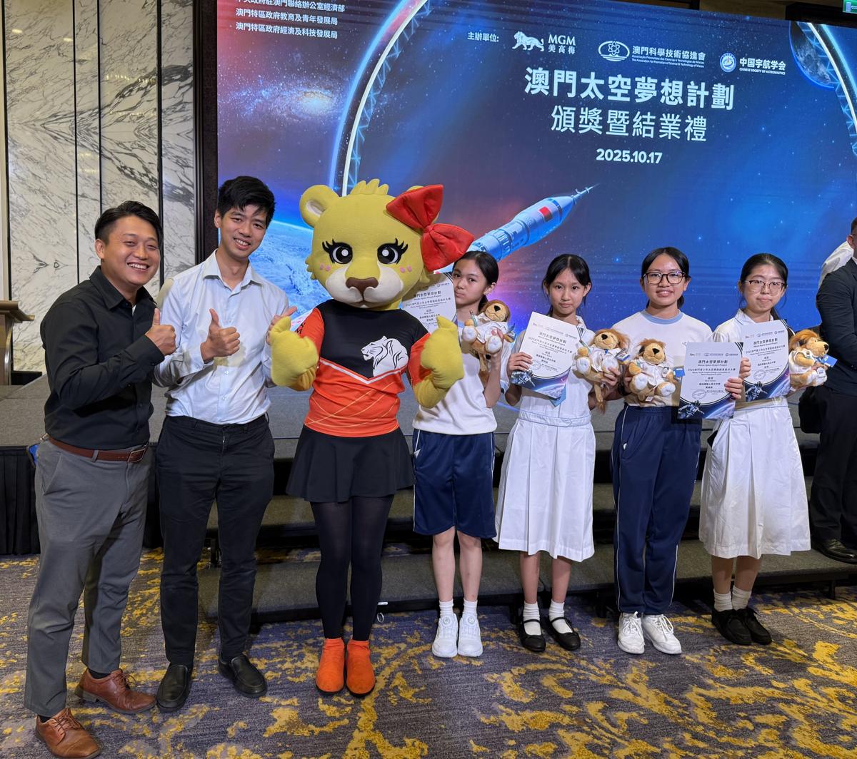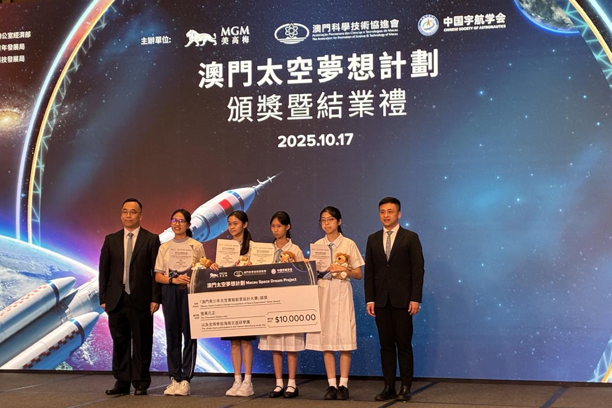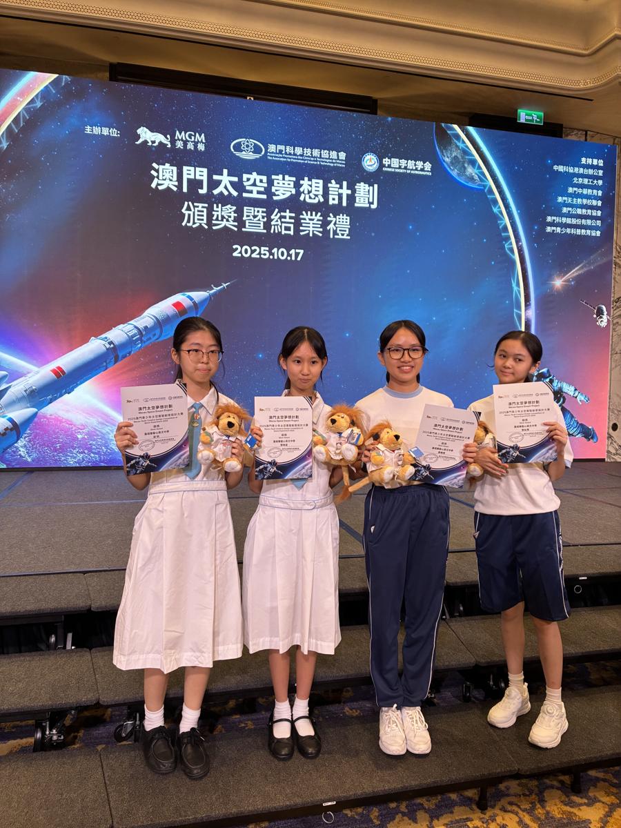 本校四位同學 Jenna Wong、Janice Lau、Gisella Lai、Millie Liang於2024/2025學年參加了由中國宇航學會、澳門科學技術協進會及美高梅共同舉辦的「澳門太空夢想計劃」,並在其系列活動「太空實驗創意設計大賽」中以「太空人工智能與大語言模型伺服器搭建構思」榮獲銀奬,得到參與海南文昌研學團以及國際空間科學與載荷大賽之資格。感謝Mr Chris Ao、Mr Wilford Lai的指導!期望同學們能繼續努力,在研學過程中精進自己,爭取在航天、航空領域作出貢獻!